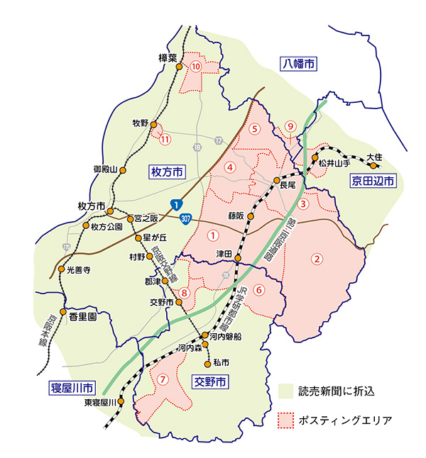 枚方市・交野市全域、寝屋川市・八幡市・京田辺市(一部)の読売新聞購読者に毎月末に一斉折込配布されます。