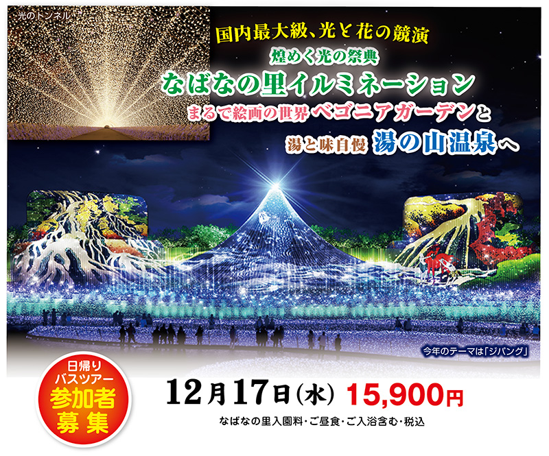 その後はジャズドリーム長島でお買い物を。そして日没には、光が奏でる世界・なばなの里へ。世界最高峰の技術と圧倒的なスケールで、想像を遥かに超える感動の連続。輝く水上イルミネーションや世界の絶景に選ばれた200mの光のトンネル、今年の新テーマエリアも色鮮やかな表現力で魅了します。また、大輪ベゴニアに包まれる夢の大温室、紅葉のライトアップもと、圧巻の競演をお楽しみください。